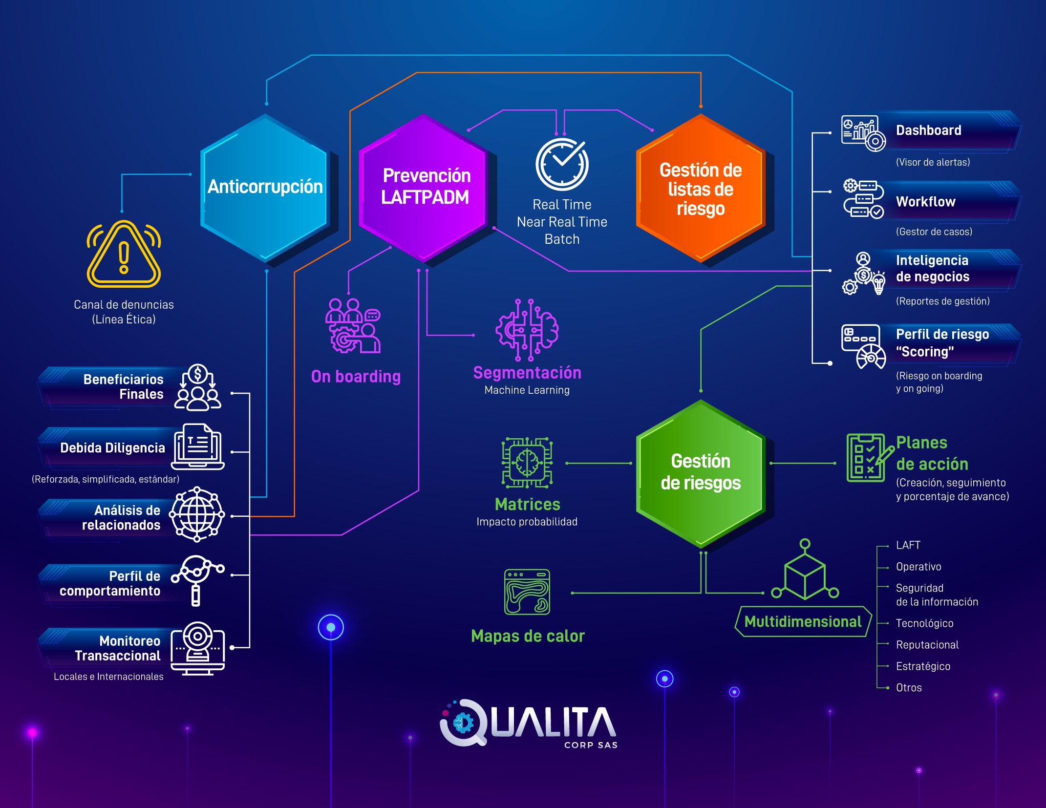 Inicialmente trabajamos desarrollo a la medida, con soluciones especializadas en ambientes Oracle y luego con el equipo de trabajo experto en prevencion de delitos financieros y no financieros, asi como la necesidad de algunos clientes que querían contar con procesos de prevención de lavado de activos y financiación del terrorismo, nos propusimos construir una suite dedicada a mejorar la forma en que las empresas mitigaban este tipo de riesgos. Dentro de este esquema, se concibió un nuevo tipo de solución que fuera integral y que realmente tuviera una automatización en el flujo de trabajo de cumplimiento, esto generó una suite de software completa que integraba y enlazaba sólidamente toda la funcionalidad necesaria, de una manera intuitiva y comprensible para los clientes que no tenían perfiles técnicos. Nuestra visión es darle otra imagen al mundo de riesgos diferente a las hojas de cálculo que estaban de moda, con la creencia de que cualquier persona podría utilizar una hoja de cálculo de Excel debe ser capaz de de administrar fácilmente los procesos en un sistema robusto de detección, con la inclusión de una metodologia de riesgo, lo que resultó en una suite fácil de usar, con una implementación rápida y rentable.