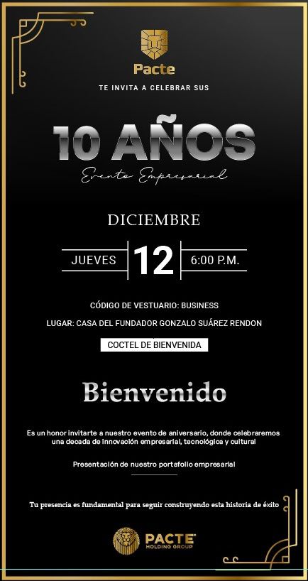 #Evento / Juan Pablo Jiménez creador de El Grupo Pacte S.A.S. celebra su décimo aniversario con el evento PACTE 10 AÑOS, una ocasión especial para destacar su impacto en Tunja y Boyacá, y presentar oficialmente su transformación en el Pacte Holding Group, un conglomerado empresarial diseñado para impulsar el desarrollo económico y empresarial de la región en las áreas de Energía Renovable, Construcción, Financiamiento, Insurtech y Marketplace agrícola.